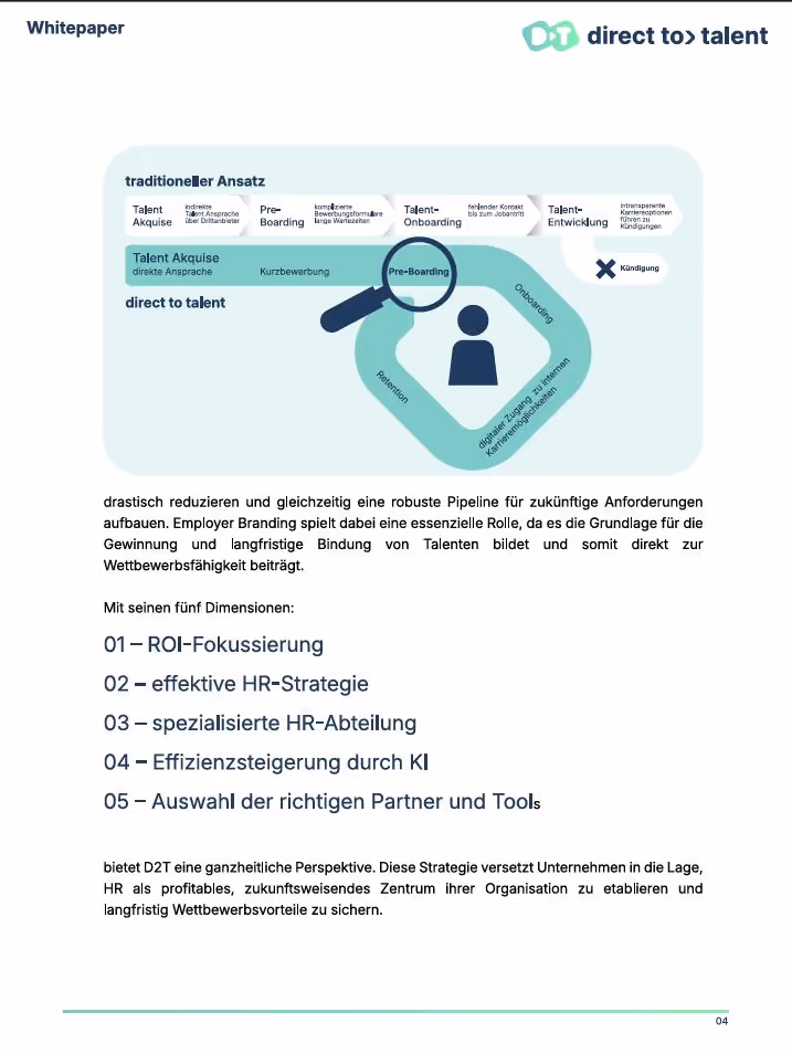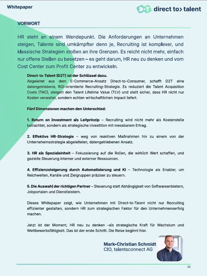 In diesem Whitepaper lernst du, wie der Direct-to-Talent-Ansatz Unternehmen hilft, Abhängigkeiten zu lösen, Prozesse zu optimieren und HR als Treiber für nachhaltigen Unternehmenserfolg zu positionieren.